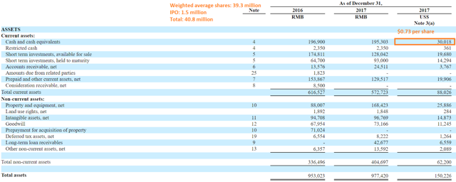 The most interesting asset is the cash. As of December 31, 2017, there were $30.0 million in cash and cash equivalents. Taking into account 40.8 million weighted average shares outstanding, I obtained $0.73 in cash per share. Ambow is trying to sell shares at $1.75 (1 ADS = 2 shares), so approximately 40% of the share price is cash. If you don��t revise the previous history of the company, the shares look quite interesting.