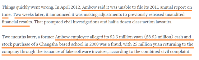 The first event happened in 2012. The company was not able to file its 2011 10-K on the due date. It also communicated that the management needed to modify previous quarterly results. That was not all. A previous employee of Ambow released that the company��s accounting was fraudulent. As a result, the pressure of the shareholders was so large that the company had to go into provisional liquidation by a court in the Cayman Islands. You need to know the following information: