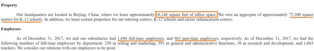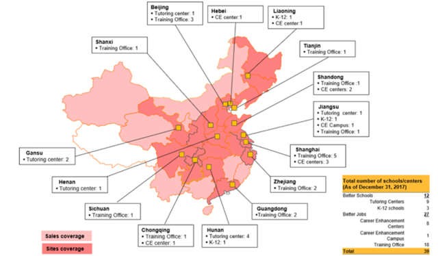 The company is not small. As of December 31, 2017, Ambow had 39 learning centers and schools. The list of units includes 3 directly operated schools, 9 tutoring centers, 18 training offices, 8 career enhancement centers, and one career enhancement campus. A priori, the business seems to be 100% based in China: