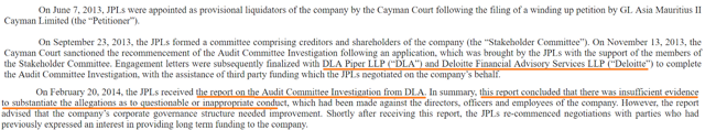 In my opinion, the Board of Directors reacted very well after the scandal. They hired Deloitte and DLA to conduct an Audit Committee investigation. The results were received in 2014. DLA ��concluded that there was insufficient evidence to substantiate the allegations as to questionable or inappropriate conduct.�� Regarding this matter, the prospectus reads as follows: