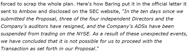 Well, we were all wrong; Baring Private Equity lost tons of millions. The reaction of the Board of Directors was completely unexpected. Instead of welcoming the offer, four independent directors and auditors resigned, which ultimately caused the ADSs to be suspended from trading on the NYSE.
