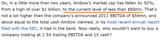 The second event happened in June 2013. Baring Private Equity, also a stakeholder of Ambow, launched a bid to acquire the company. I have to admit that I thought that the move was brilliant. The company was trading at about 1.5x trailing EBITDA and one time its cash per share:
