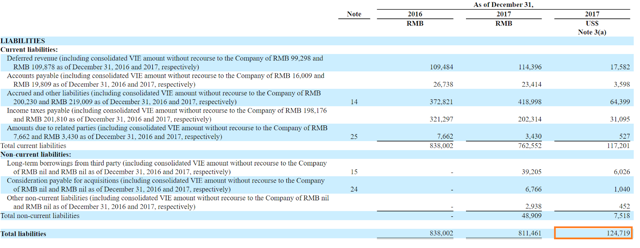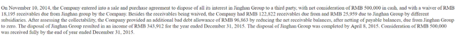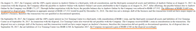 While the company had no financial debt, it did have a large amount of accounts payable a few years ago, which had to be reduced. In order to do so, in 2017, Ambow sold subsidiaries Ambow Online and 21st Training Center for nil consideration and 1 yuan respectively. Additionally, it had to sell its interests in Jinghan Group receiving approximately $0.075 million (RMB 500,000 x $0.15/RMB). In this regard, this is the information given in the prospectus: