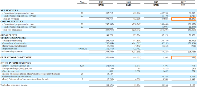 Regarding the income statement, in 2017, the company reported revenues of $68.2 million, or $1.67 per share. That��s another interesting ratio showing the undervaluation of Ambow. On top of it, the company is also reporting gross income of $28.8 million and positive operating income of $0.3 million.